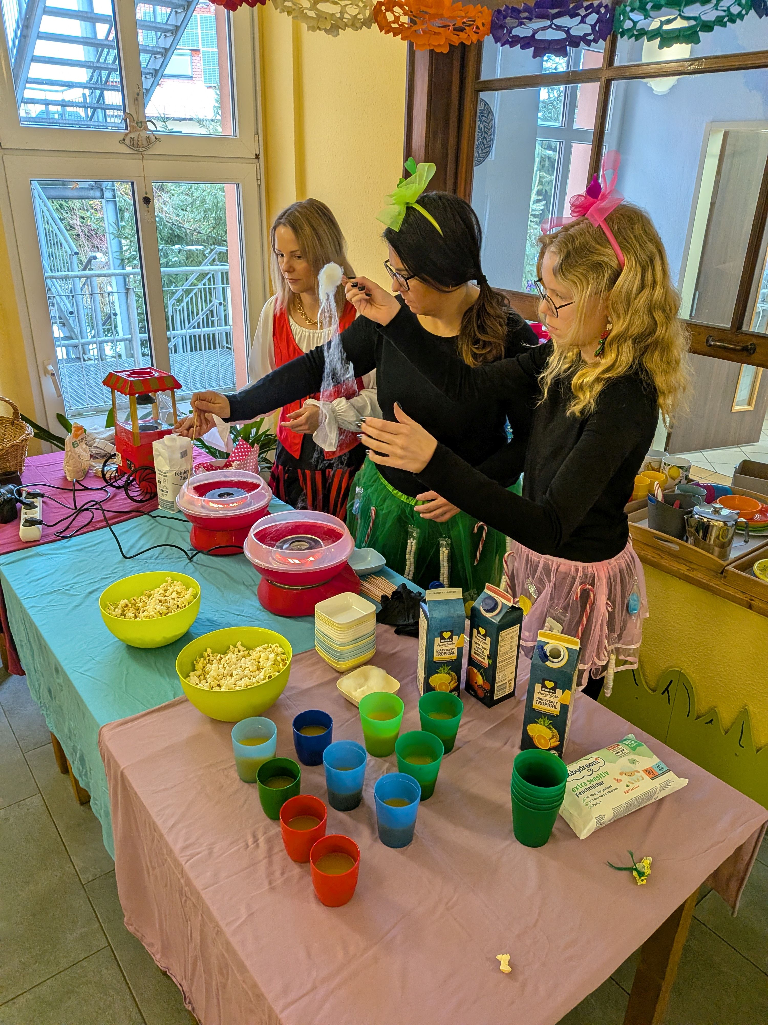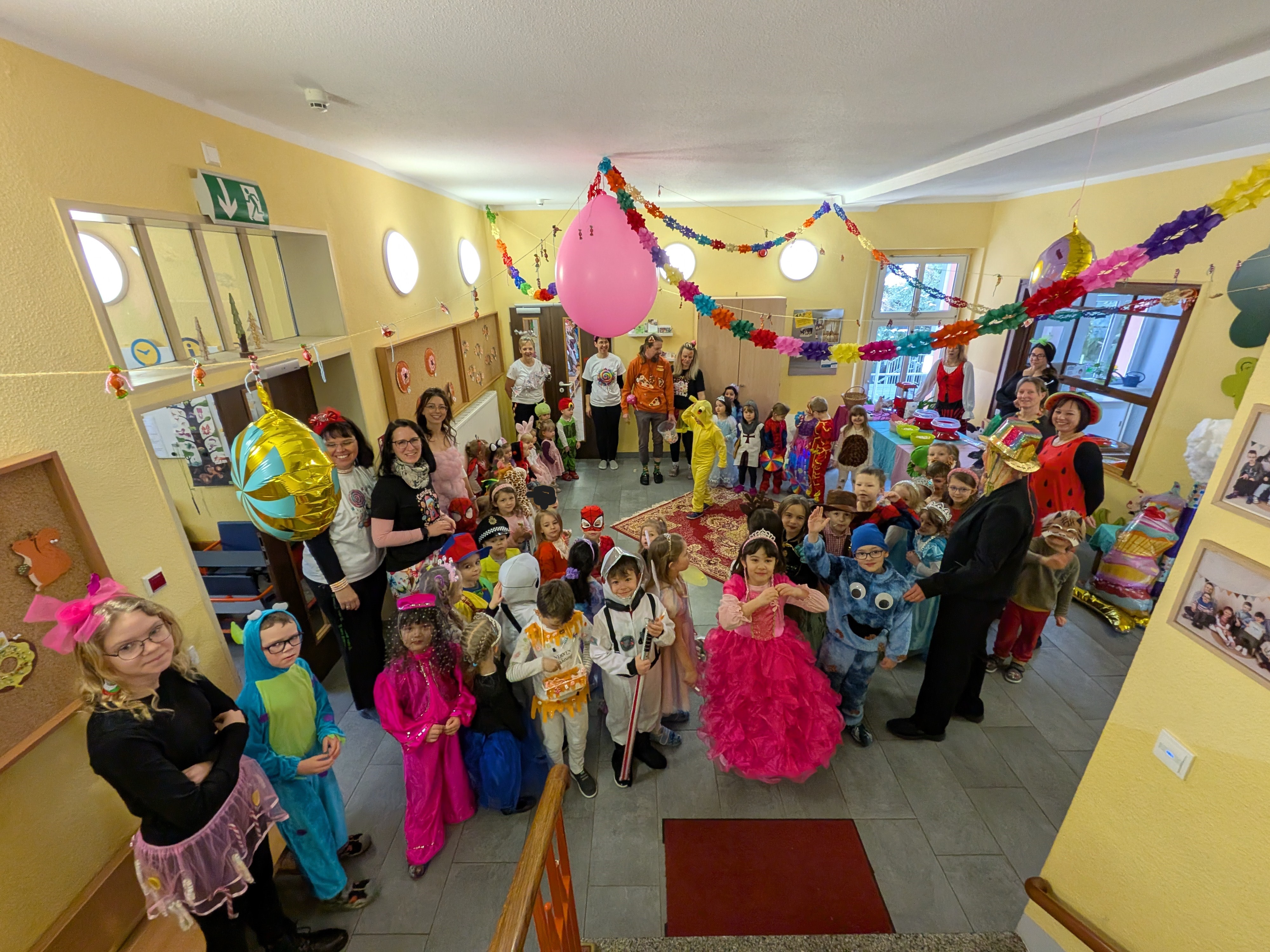 Unser Haus war mit allerhand Bonbons, Gummibärchen und anderen Leckereien geschmückt. Neben der besonderen Deko waren Popcorn und Zuckerwatte zum Naschen die Highlights. Nach der Vorstellung aller Kostüme im Foyer, standen auch lustige Spiele auf dem Programm: unteranderem Wackelpuddingwettessen mit Messer und Gabel, Nudelbilderlegen, Würstchen vom Galgen essen und vieles mehr. Die Party war ein voller Erfolg, mit viel Spaß, Lachen und süßen Leckereien – ein unvergesslicher Tag für alle Kinder.