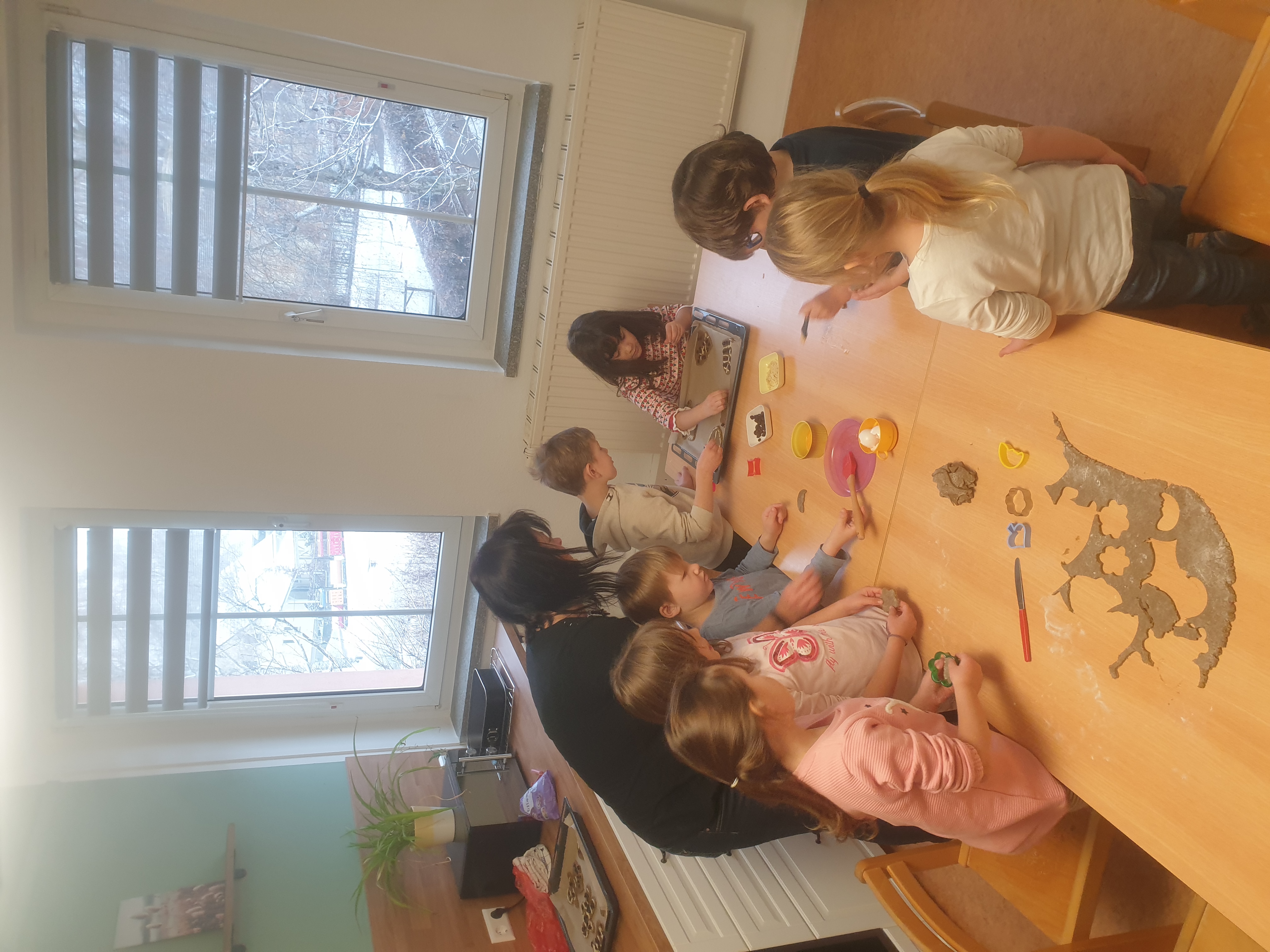 Jedes Kind suchte sich eine große Form zum Ausstechen aus, diese wurde mit einem Pinsel mit Eigelb bestrichen, dann auf das Backpapier gelegt und dort mit Rosinen und Mandeln verziert.